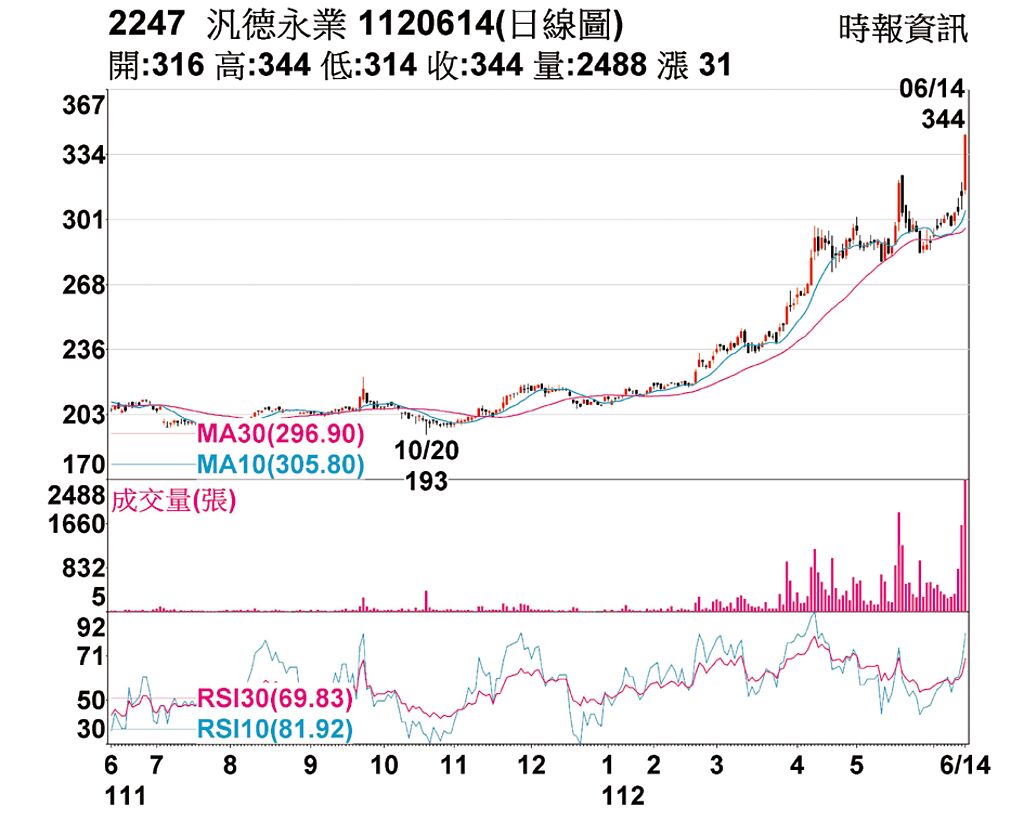 汎德永業(2247)5月營收首破50億元攻頂,14日股價帶量大漲,終場衝上344元漲停價作收,創上市以來新天價,拉出一根長紅K棒,今年以來漲幅高達62.26%。除站穩短中長期均線,均線同步上彎,KD指標亦呈現多頭排列。