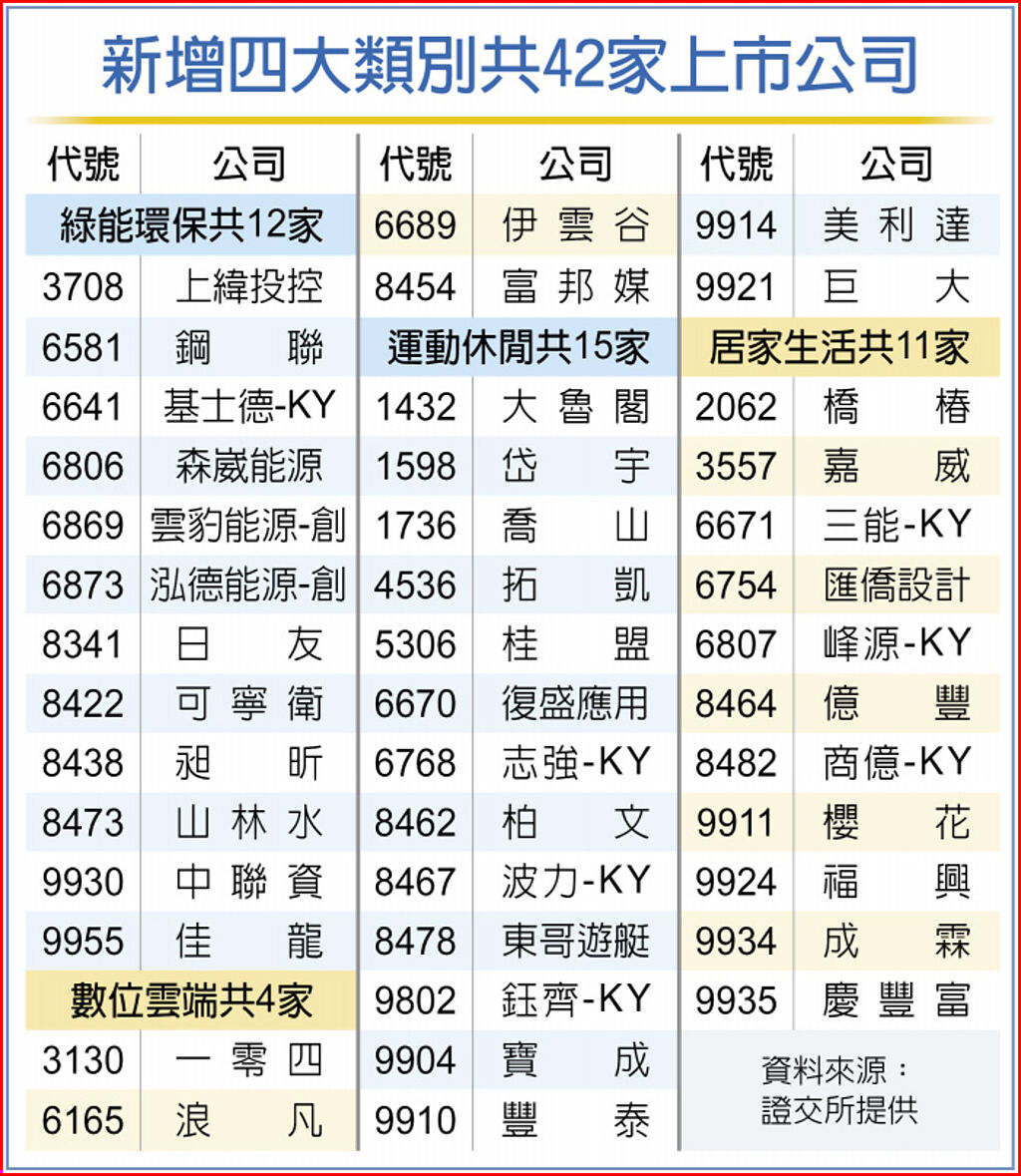 此次新增的產業類別包括:「綠能環保」、「數位雲端」、「運動休閒」以及「居家生活」;另調整「觀光事業」名稱為「觀光餐旅」,證交所以更貼切、清晰易懂的產業類別名稱,能使投資人易於聚焦,掌握產業脈動。