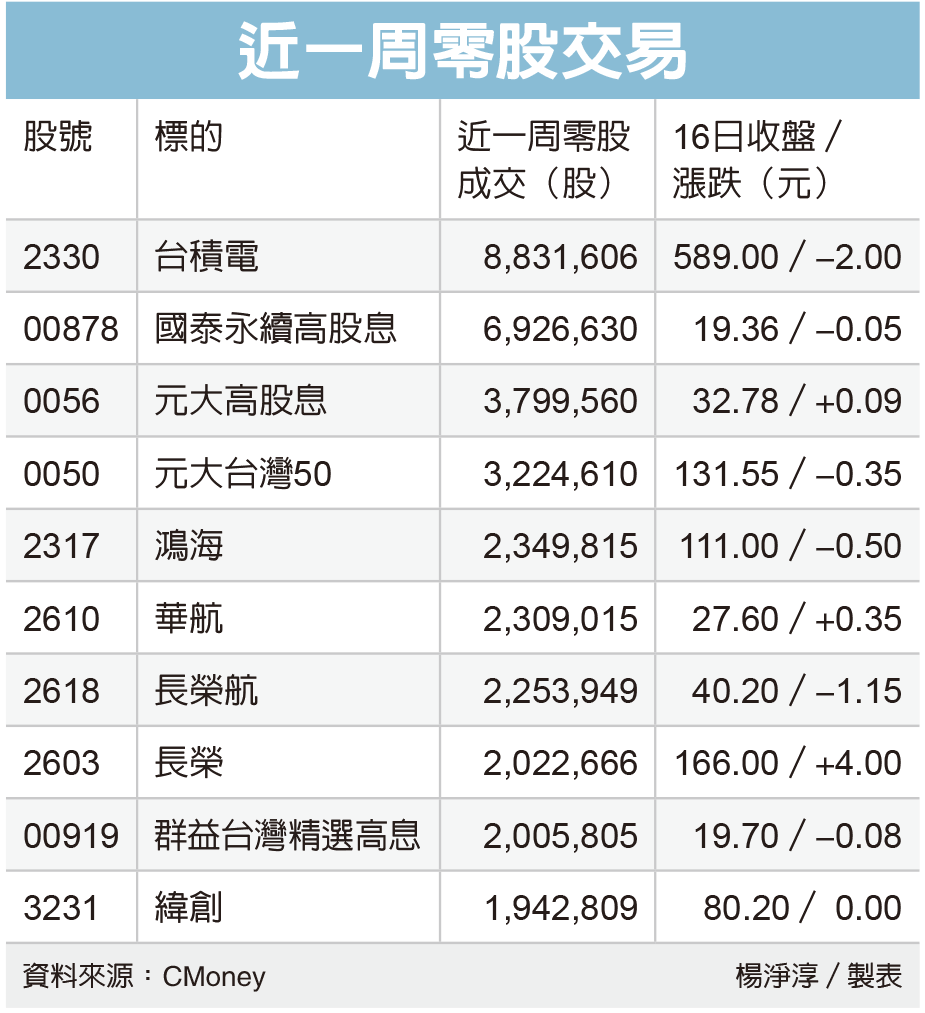本周前十熱門零股標的還有國泰永續高股息、元大高股息、元大台灣50、鴻海、華航、長榮航、長榮、群益台灣精選高息及緯創,成交692.6萬股至194.2萬不等,涵蓋了半導體、電子零組件、航運股等產業;ETF則有四檔入列。