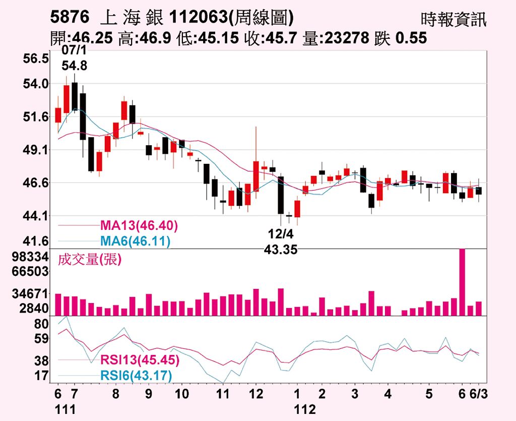 三大法人買賣超方面,外資賣超1,707張、投信賣超51張、自營商買超544張。技術線型觀察,上海商銀股價現在位於周線、月線、季線下,上海銀16日收在45.7元,周跌1.19%。 |