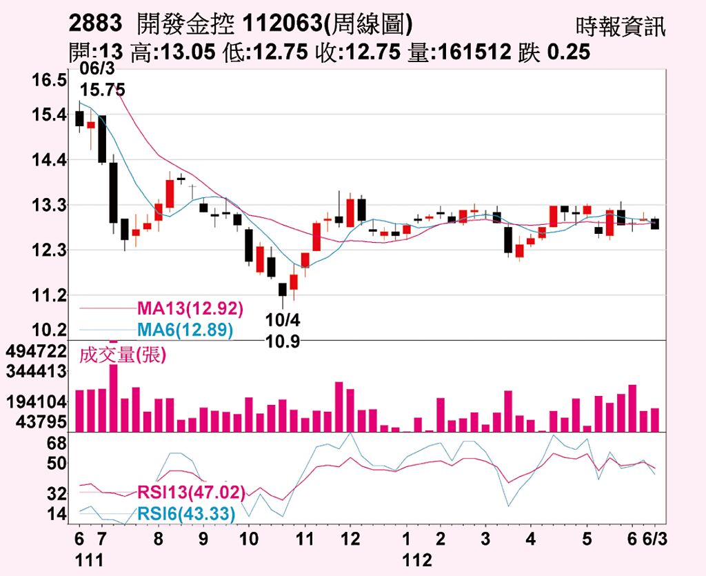 開發金16日股價收在12.75元,下跌0.05元,累計近五個交易日三大法人共計賣超26,221張,其中外資法人賣超28,437張、投信買超2,372張、自營商賣超156張。線型上來看,股價失守周線12.84元,量能成為能否轉強的重要指標。 |