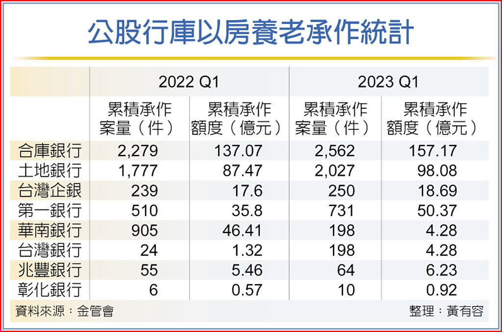 持續高利率環境下,也讓「以房養老」借款人每月需支付的利息增加,影響實領的生活費,讓部分銀行相關案件略微衰退,不過台灣人「有土斯有財」的觀念仍甚,比起賣掉既有不動產,高齡長者更願意以不動產抵押取得每月生活費,大部分公股銀行表示,今年前五月承作件數還是小幅成長。