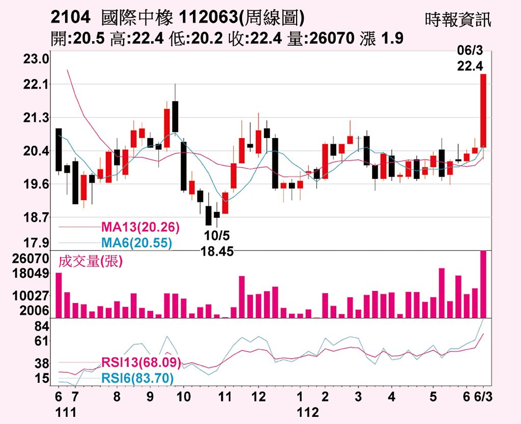 中橡(2104)全力攻利基型碳黑,市場對未來營運有期待,外資、法人買盤逢低承接,16日以大量突破前波整理區間頸線21元,收盤漲停22.4元,站穩所有短均線之上,短期周線趨勢在上周反轉往上。月線及季線趨勢也已出現止跌往上跡象。9日KD值趨線在上周也低檔黃金交叉開始走高。加上16日量能急速放大,多頭表態作多意願濃。近期量能若能持續,股價可望持續向24元整數關卡邁進。