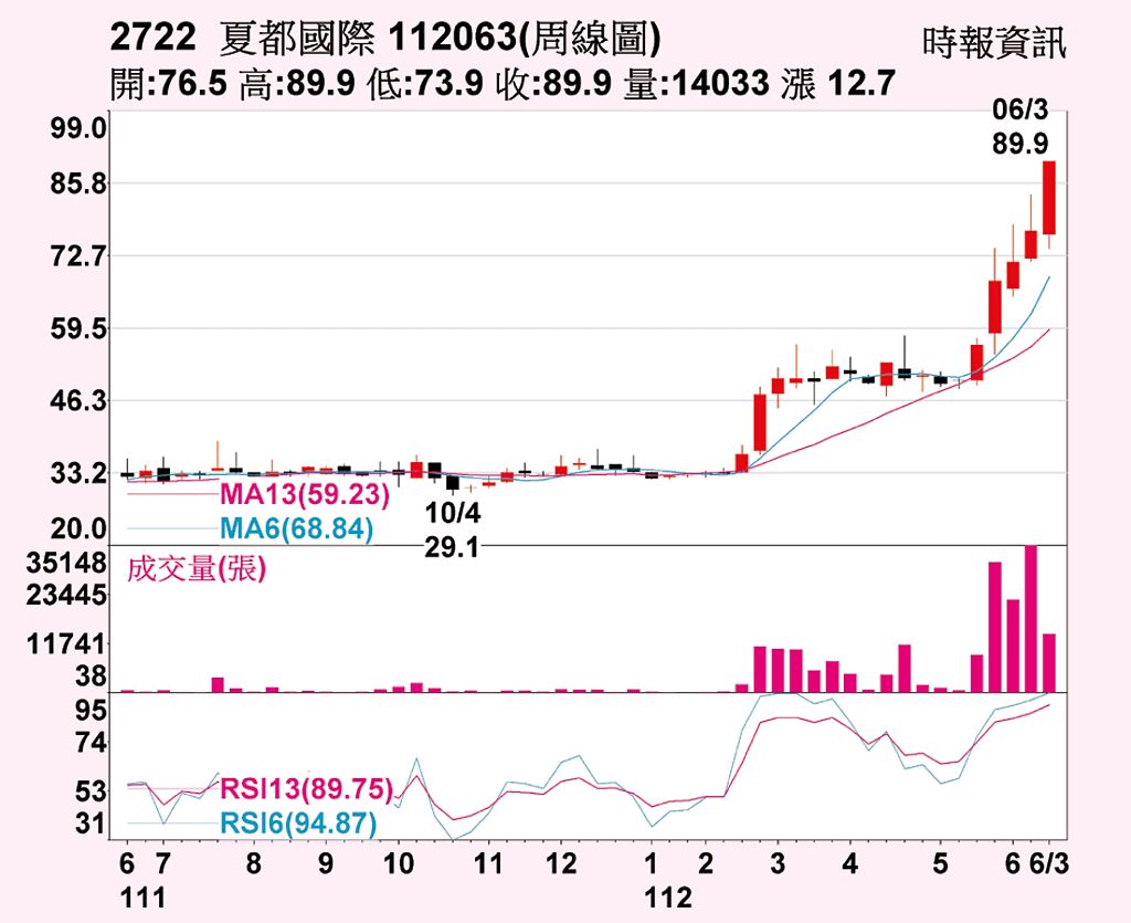 夏都(2722)股價近日持續上攻,16日在買盤敲進下放量直攻漲停價89.9元,再創上市新高價,成交量跳增8成至3,522張。上周合計大漲16.45%、周線連六紅,一個月來飆漲85.4%。三大法人近期偏多操作,16日買超107張,上周合計買超達1,046張,其中外資大舉買超達1,072張。