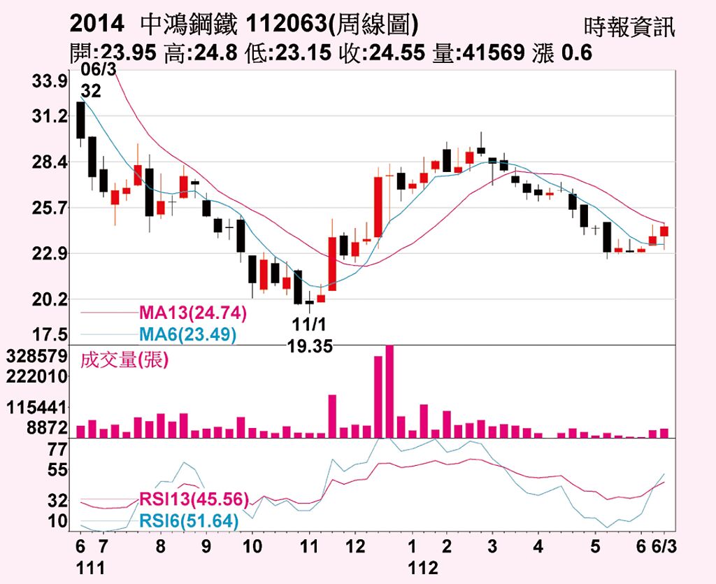 中鴻(2014)受惠於鋼價底部訊號浮現,與看好下半年鋼市景氣後,16日股價表現亮眼,每股大漲0.90元,收在24.55元、單日漲幅3.81%,單日成交量達到18,744張,後市行情依然看好。