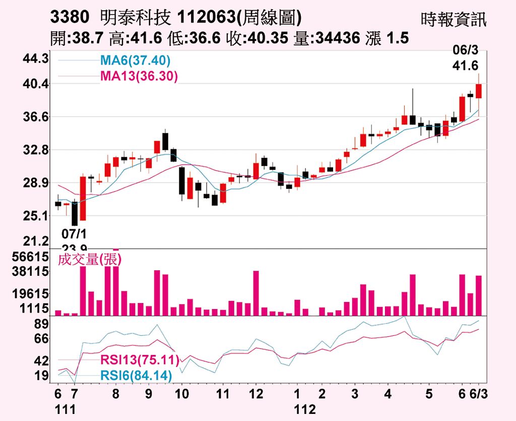 通訊設備大廠明泰(3380)今年來呈現驚驚漲格局,股價已從28元來到40元整數關卡,16日一度衝高攻抵41.6元新高,惟盤中賣壓湧現,出現爆量長上影線作收,短期走勢恐稍作震盪休息,近年明泰積極擴展網路交換器應用,積極導入資料中心業務,目前預計800G交換器將在今年第四季送樣客戶認證,預計將成為2024年主力出貨產品。