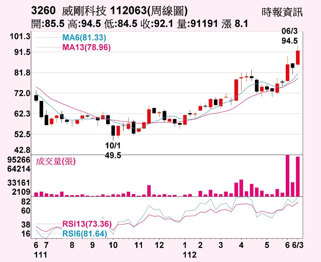記憶體模組廠威剛(3260)16日股價大漲4.9%,以92.1元作收,成交量爆出3.7萬張大量,技術線型短中長期均線均呈向上趨勢。本周外資買超3,249張,投信買超1,704張,自營商買超2,144張,合計買超7,097張,三大法人合力買進。