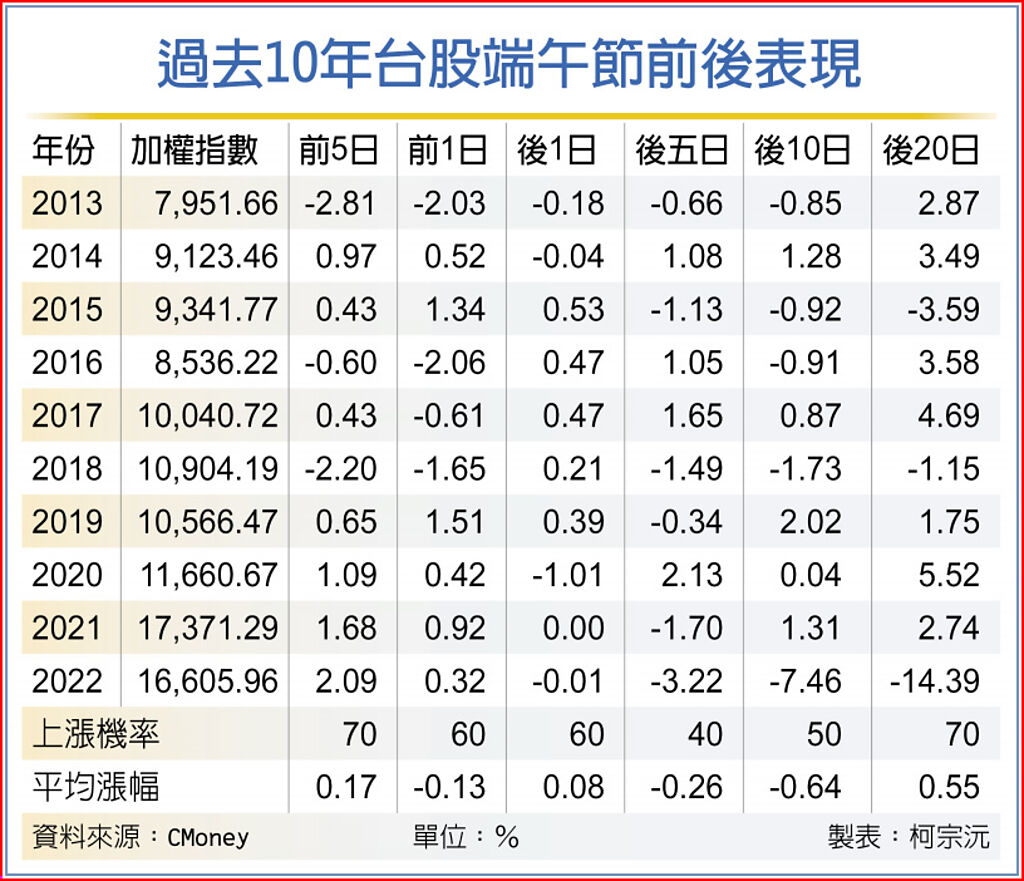 據過去15年資料顯示,台股在端午節前五日上漲機率近7成,但節後下跌機率驟增,後五日與後十日的下跌機率皆有6成,平均跌幅分別為0.5%、1.7%。由於今年端午節前的加權指數表現搶眼,以奔牛行情的方式突破萬七關卡,創下17,346點波段新高,技術指標短線出現過熱跡象,讓端午變盤的說法甚囂塵上。