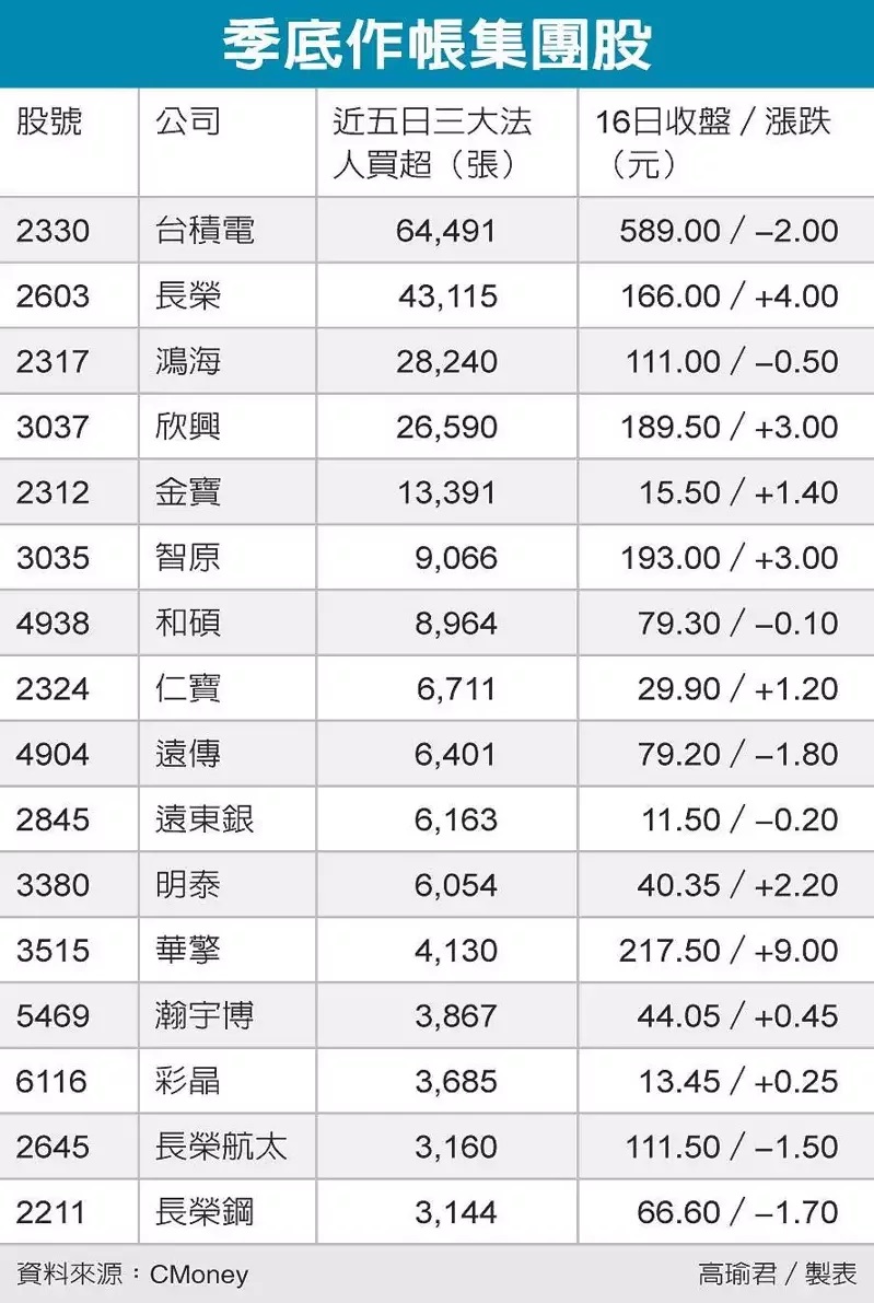 根據CMoney統計,近期三大法人偏多操作的集團指標有台積電、鴻海、聯電、新金寶、華碩、遠東、明基友達、華新麗華、長榮等在法人買盤加持下,有機會為季底作帳行情再添把柴火。