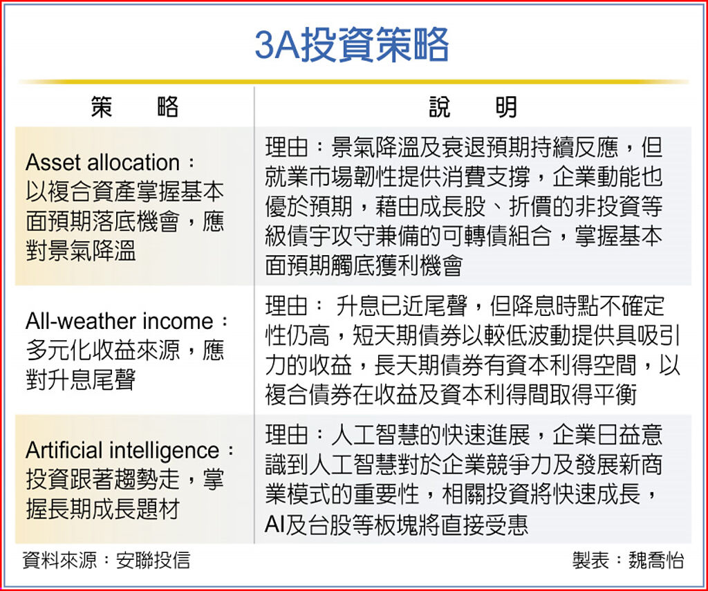 安聯投信表示,排除重度衰退後,基本面改善及經濟增長放緩使得利率收益率下滑,過去歷經評價面修正的成長股,將可望有所表現。預期緊縮週期已近尾聲,意味聯準會將減少抑制成長和通膨措施。第三季投資可把握「3A」策略。一是資產配置Asset allocation,考量景氣降溫及衰退預期持續反應,但就業市場韌性提供消費支撐,企業動能也優於預期,藉由成長股、折價的非投資等級債宇攻守兼備的可轉債組合,掌握基本面預期觸底獲利機會。