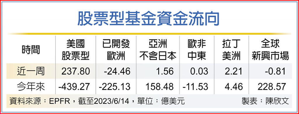 統計過去一周全球股市資金流向,除全球新興市場與已開發歐洲兩地股市資金淨流出外,其餘股市多迎來資金淨流入,其中又以美股基金單周淨流入237.8億美元,動能居全球股市之冠。