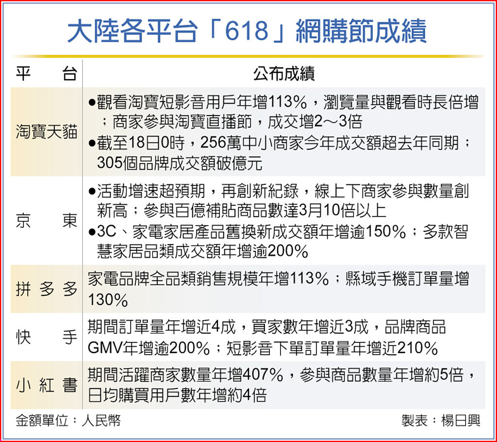 大陸電商口中史上最砸重本的「618」購物節正式落幕,雖然各平台沒公布具體數字,但在淘寶天貓、京東也加入低價補貼行列下,兩大電商拿出各指標正增長、超預期的成績單,成功撬動大陸當下低迷的消費狀況。