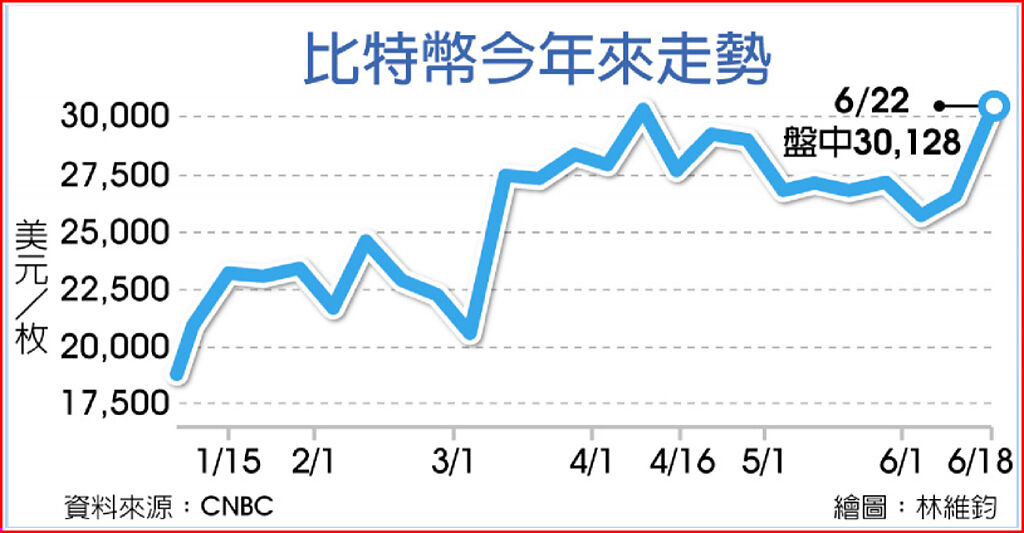 傳統金融巨擘加速進軍加密通貨市場,包括貝萊德(BlackRock)在內的資產管理公司相繼申請推出比特幣現貨ETF(指數股票型基金)。此消息提振投資人樂觀情緒,帶動比特幣22日價格一舉突破3萬美元關卡,此為今年4月以來首見。