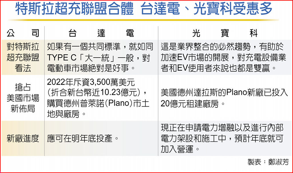 由於北美三大電動車品牌已就充電硬體標準達成一致,意味未來北美逾五分之三的電動車都將使用同一套充電系統標準,市場大一統在望,對深耕充電椿多年的台達電、光寶科是一大利多,業績進補指日可待。