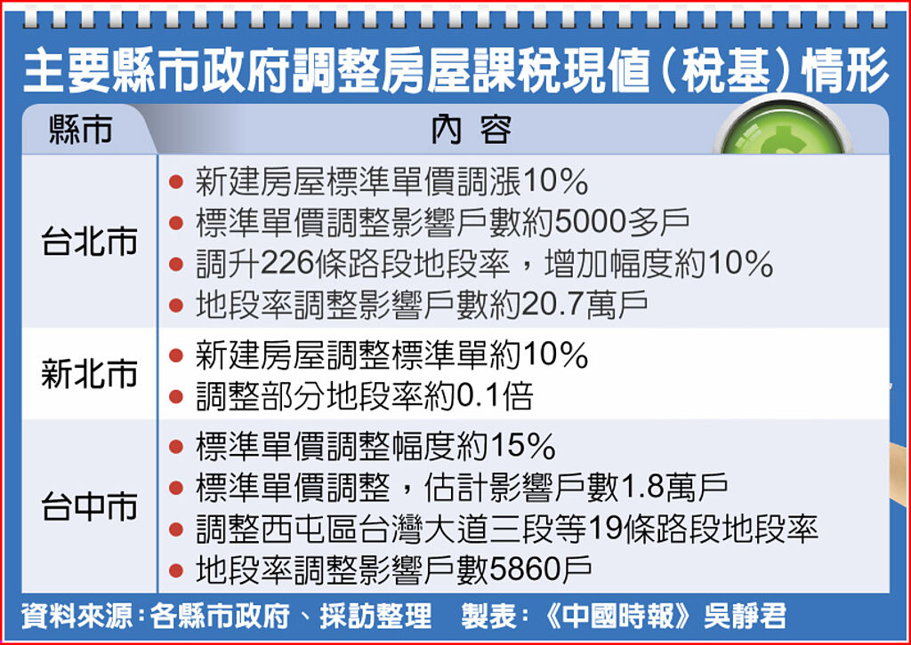 營建成本大漲,縣市政府重新檢討房屋標準單價,台北市、新北市、台中市、高雄市與苗栗縣皆公告調整稅基,調幅大約在10%到15%,將在今年7月起實施,明年5月繳交房屋稅時將會很有感。以台北市為例,7月之後新建房屋、面積30坪、地段率沒有被調整、自住的情況之下,每戶稅額增加約1800元。