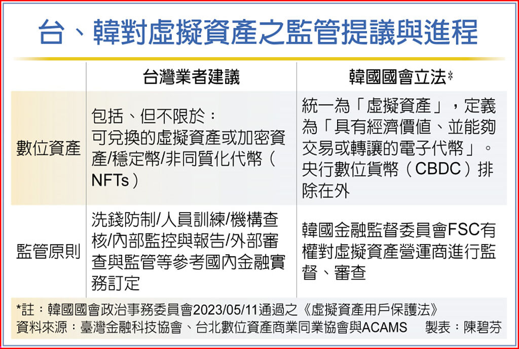 虛擬通貨由金管會逐步納管,110年6月30日發布「虛擬通貨平台及交易業務事業防制洗錢及打擊資恐辦法」,112年3月30日擔任具金融投資或支付性質之虛擬資產平台的主管機關;並在立法院回覆立委,9月將完成「管理虛擬資產平台及交易業務事業(VASP)指導原則」。在台灣冗長的研議納管過程,韓國國會政治事務委員會已於今年5月11日通過《虛擬資產用戶保護法》,被視為為韓國「首部針對虛擬資產的立法」。