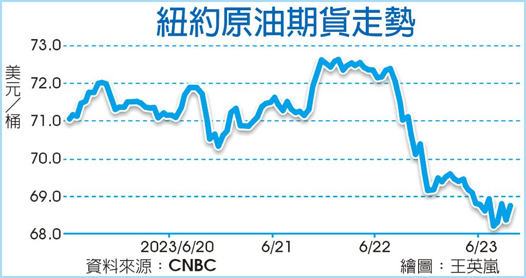 國際油價22日每桶重挫4%後,23日盤中續跌約1%,連兩天走黑,紐約西德州期貨報68.8美元,倫敦布蘭特報73.5美元。以此計算,兩者本周累跌4%。雖然美國上周原油庫存減少近400萬桶,本應有利油價走高,但英國央行意外升息2碼,讓人擔心經濟前景會拖累能源需求。 |