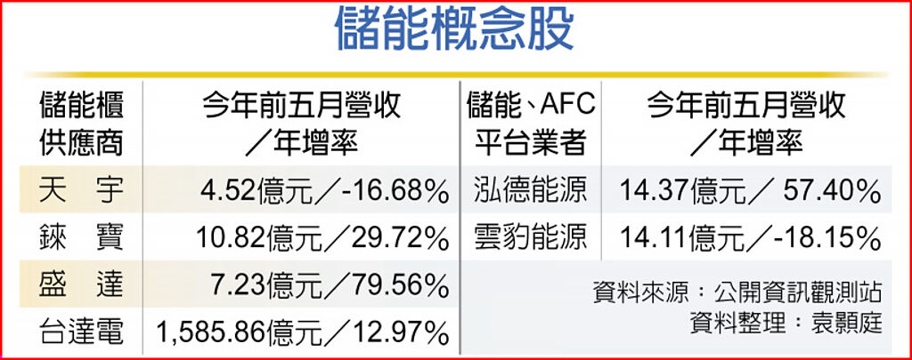綠電需求旺,也帶動儲能商機爆發!天宇、錸寶旗下來穎、以及盛達轉投資盛齊綠能手握儲能櫃訂單,台達電提供完整的儲能解決方案,今年儲能櫃供應商業績都衝刺20%~30%的高成長。