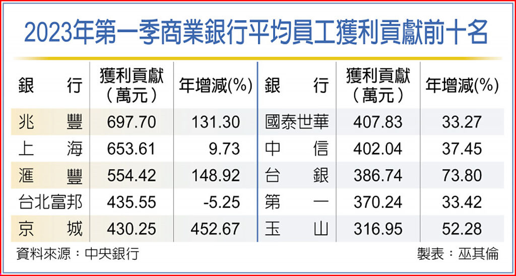 根據央行統計,第一季國銀每一行員獲利貢獻,有24家逾200萬元,若排除輸出入銀行的570.52萬元,及全國農業金庫的483.7萬元,其餘38家商業銀行中,本季第一名由兆豐銀行的697.7萬元拿下,逼近700萬元表現亮眼;近幾季蟬聯首位的國銀模範生上海商銀,以653.61億元居第二名;滙豐銀行554.42萬元,一舉由上季的第十名上升至第三名。