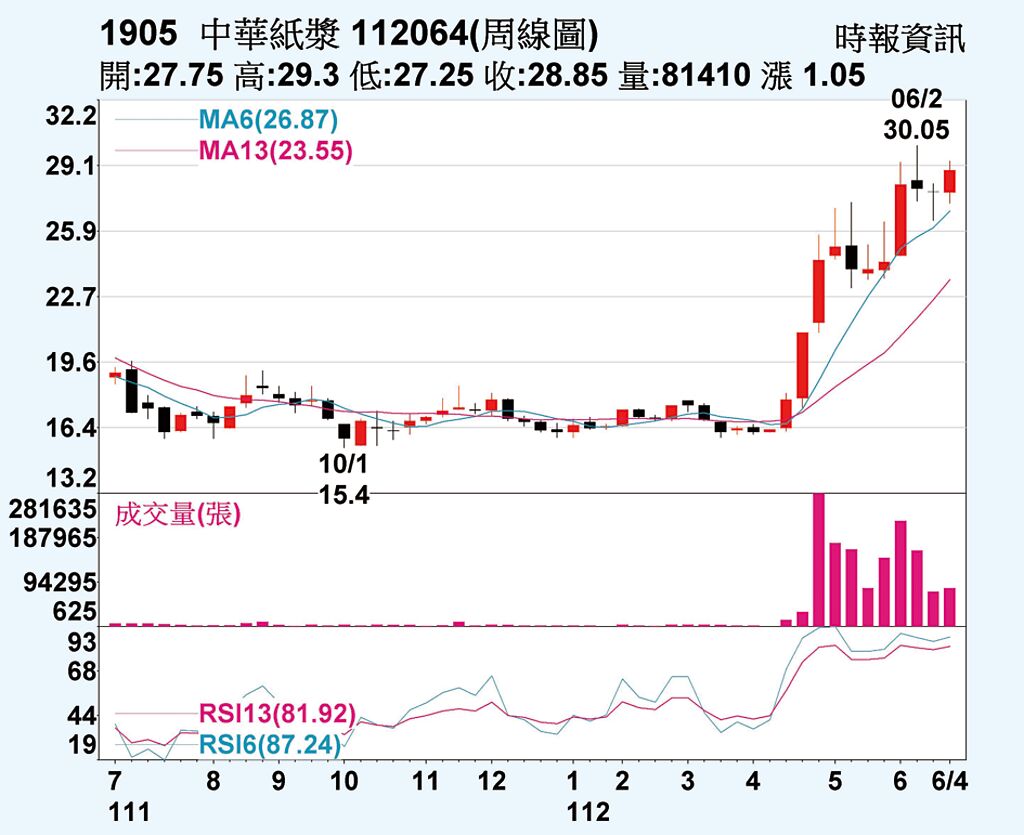 華紙(1905)上周三上漲3.96%、收28.85元,沿5日線上下震盪走堅,技術面呈現下跌量縮、上漲量增格局,因量價配合得宜,仍有機會挑戰前波30.05元高點,周漲幅3.78%。