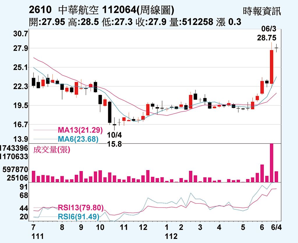 華航(2610)21日三大法人買超逾1.1萬張,上漲1.27%、收在27.9元,近幾日股價在高檔呈現量縮整理走勢,仍守在5日線27.5元之上,後續若量能增溫,有機會持續上攻挑戰3字頭,周漲幅1.09%。