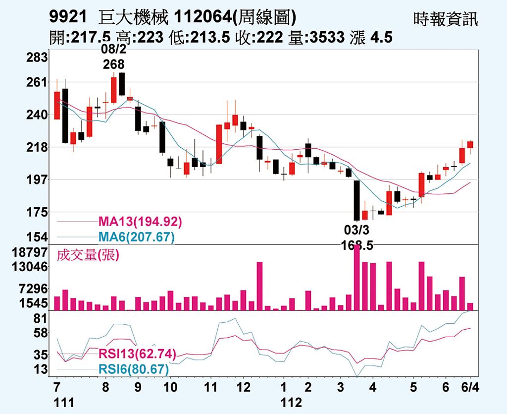 巨大(9921)上周三在三大法人聯袂買超490張加持下,股價沿著10日線上漲,收盤價222元、上漲5.5元,成交量破1,500張。日KD在高檔交叉向上,四線多排向上,月KD也從低檔突破20交叉向上,在三大法人買超力挺下持續看多,有機會挑戰前一波高點234元。