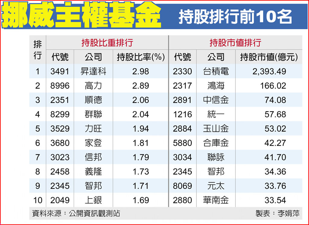 根據股市觀測站公告統計,挪威主權基金名列台股上市櫃公司前十大股東,電子股高達34檔,包括昇達科、群聯、力旺、家登、信邦、義隆、智邦、台積電等;另有新普、聯詠、瑞儀、漢唐、京元電子及致伸現金殖利率逾4%,也成為加碼標的。