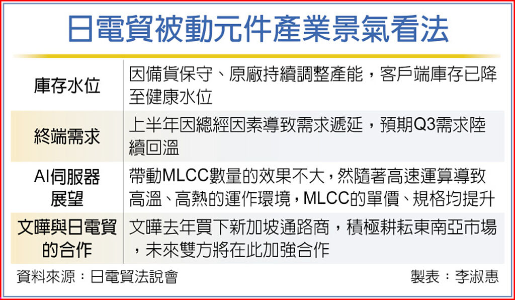 日電貿在法說會上表示,今年上半年市場景氣仍受外資因素影響,導致需求延遲,預期第三季市場需求可望陸續改善回溫,至於電容需求方面,整體市場庫存持續在調整和去化中,各大廠目前仍調整產能,因此價格與最差的時候相比,已經回穩,客戶端的庫存也逐步降至健康水位,而就高階規格來看,上半年高階規格需求持續成長,主要因AI人工智慧和5G相關需求激勵,整體需求可望在下半年逐步回溫。