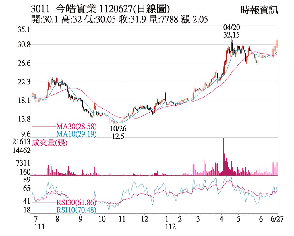今皓(3011)因搭上車用題材專車,股價驚驚漲,27日順勢帶量攻占30元整數關卡,儘管盤中高點32元仍無法順利越過今年波段高點32.15元,但以收盤價計,終場仍以31.9元、上漲6.87%成功創高,表現仍算是可圈可點。