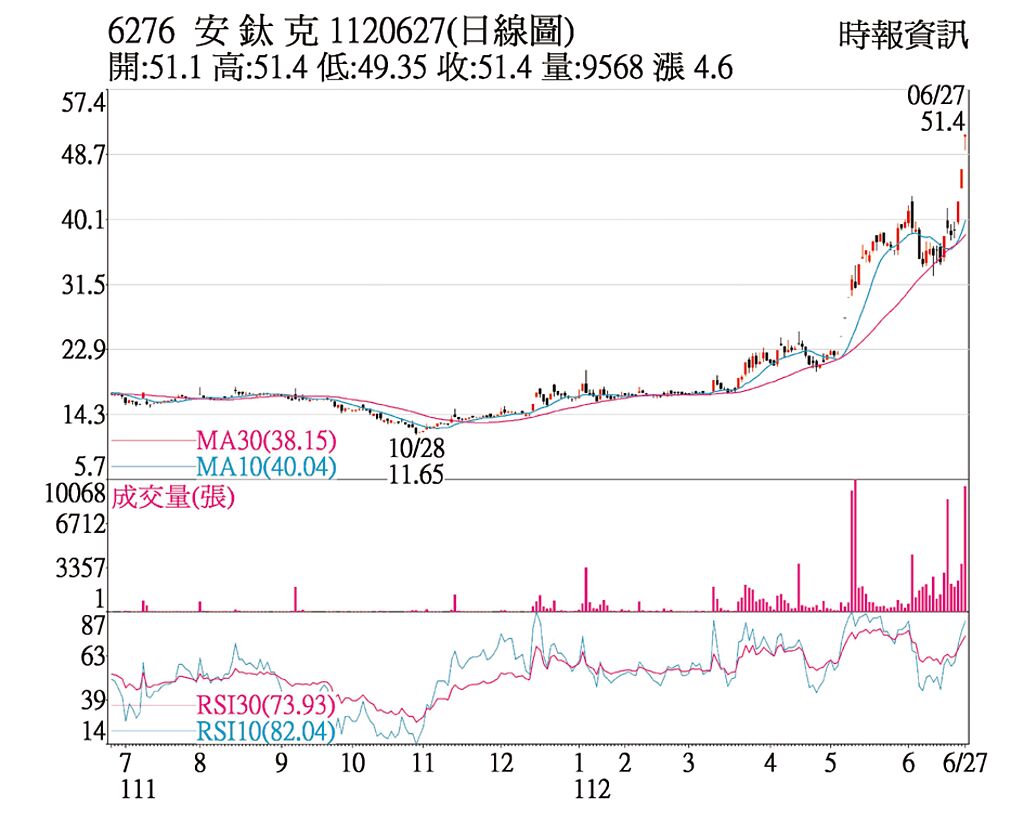 安鈦克(6276)去年第四季業績大爆發,單季每股稅後純益(EPS)0.95元,創下2021年首季以來的新高,挾著轉機題材,再加上今年首季EPS續穩在0.78元,明顯優於去年同期的每股淨損0.3元,推動股價續揚,27日衝關50元大關得利,在買氣可用下,不到10點就直接漲停鎖死,終場續以51.4元再創波段新高。