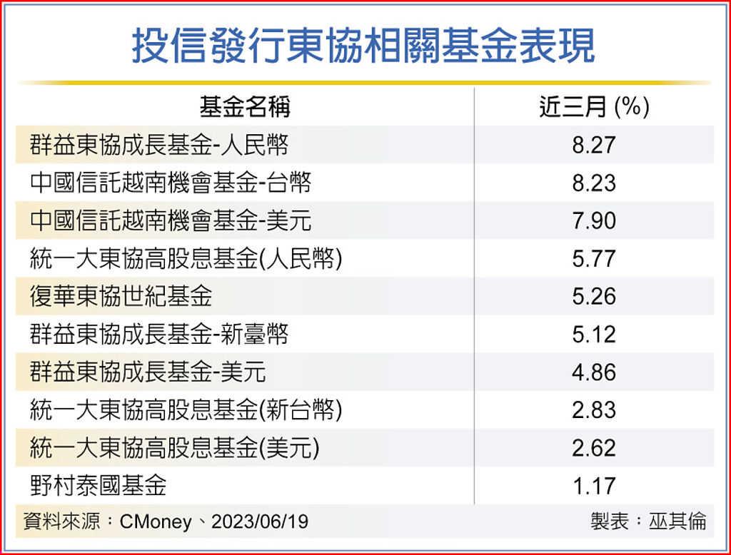 近期通膨趨緩、美聯準會(Fed)如預期暫停升息,市場持續關注經濟衰退等訊息,東協的新加坡、馬來西亞、泰國、印尼與菲律賓等五國股市,近三個月股市小漲小跌。投信法人表示,整體東協國家經濟數據表現仍相對穩健,通膨持續向下,企業EPS可望有雙位數水準,加上國際解封下觀光業復甦,及各國政策加持,中長期東協股市不看淡,建議透過東協基金分批佈局,把握投資契機。