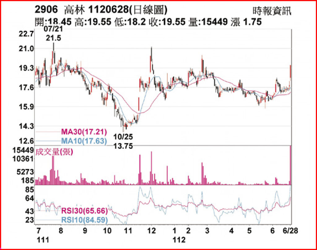 高林實業(2906)受惠下半年與日本BCG合作跨足餐飲展店利多,觀光零售題材增溫,28日在外資買超帶動下飆漲停,來到19.55元,為近年股價次高,成交量能逾1.5萬張,隨著開店速度行情飆高。