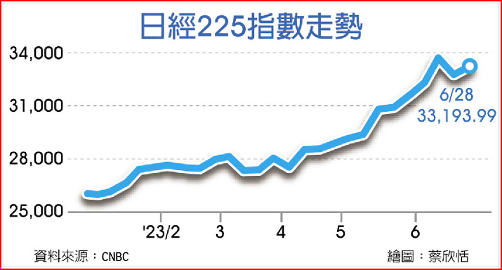 受到美股收紅激勵,日股28日開高走高,日經225指數收盤大漲2.0%,收報33,193.99點。美國經濟指標強勁代表經濟前景偏多,有利於日本的出口展望。日本電信單日暴漲5.2%,豐田汽車大漲2.8%,野村控股也強升3.7%。日圓匯價則小幅反彈至143.94兌1美元,高於紐約匯市尾盤的144.07日圓。 |