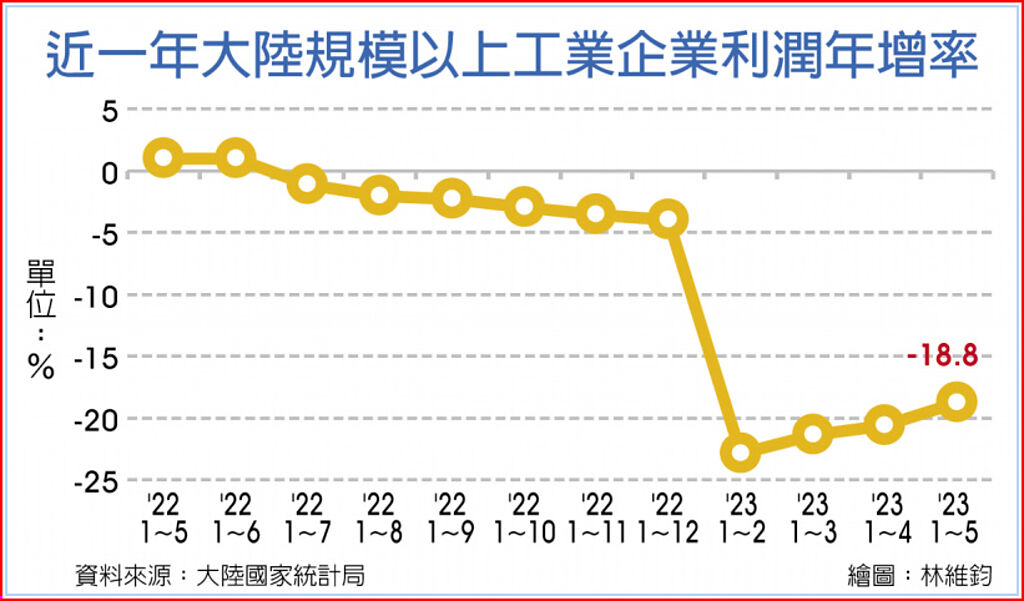 大陸國家統計局28日公布今年1~5月規模以上工業企業實現利潤總額,呈現年減18.8%,降幅雖較1至4月份收窄,但官方坦言,受內需不足等因素拖累,工業企業復甦緩慢且基礎仍不牢固。另有專家指出,民營企業的盈利降幅仍大,恐成經濟回穩的隱憂。