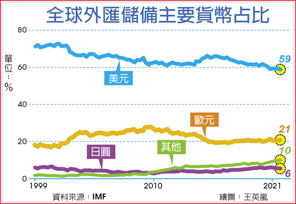 根據國際貨幣基金(IMF)資料,進入本世紀之初,美元占全球外匯儲備的比重超過70%。
