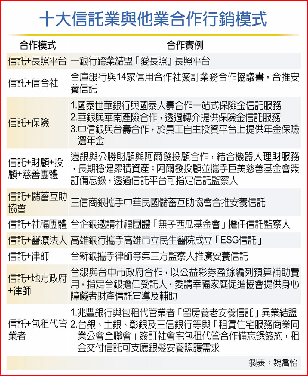 響應金管會推動信託2.0政策,國銀為創新信託服務紛出招。中信銀行從三大構面拚創新,包括企業、保險金信託、個人投資上都有創新信託服務,且進行跨業結盟;國泰世華銀行「微型安養信託」幫長者「老本」再多上一道鎖;兆豐銀行兵分五路提升信託的服務品質及內容。至於華南銀行,則射出「家庭延續+企業傳承+社會永續」的傳承信託三箭。