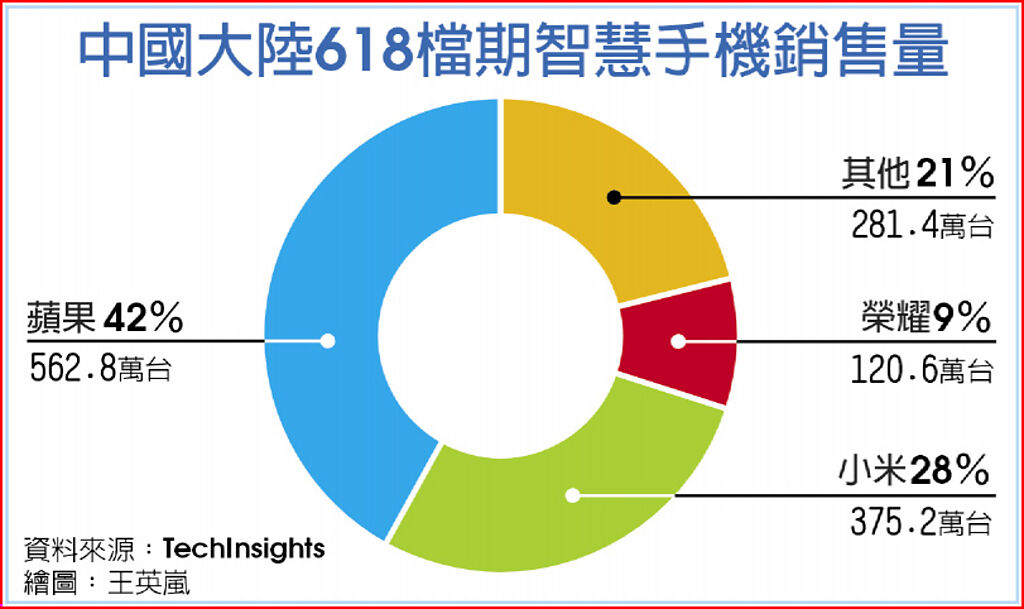 中國大陸今年消費力疲弱,特別是智慧手機市場急凍,廠商多寄望618檔期回溫,惟根據市調機構TechInsights最新報告指出,今年618智慧手機銷售量達1,340萬台,還是較去年同期下降7%。