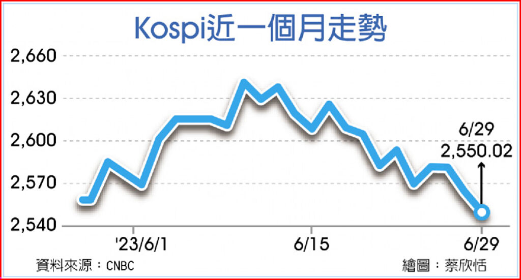 聯準會(Fed)主席鮑爾在葡萄牙歐央論壇重申今年底前可能多次升息,確認全球利率前景持續偏向緊縮,投資人從而轉趨觀望,韓國大盤29日走跌,Kospi收在2,550.02點,下跌0.55%,為連續第三個交易日收黑。好消息是,幾乎一整天拋售股票的外資尾盤轉賣為買,當日買超328億韓元,散戶總計買超1,293億韓元。 |