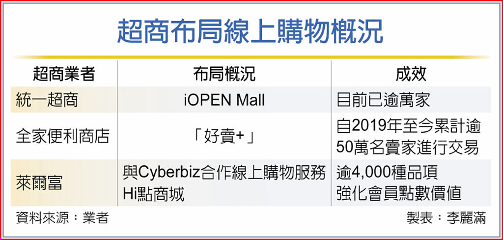 事實上,近年超商瞄準網購商機皆有不少動作,超商老二「全家」自2019年起即推出「好賣+」平台,主要著重於金流系統等服務,憑藉其4,100間門市、便捷多溫層物流網絡與1,650萬會員,協助賣家輕鬆開店、買家快速下單,其中更以平台免使用費、低運費、會員分層管理、VIP賣家包裹到府收貨服務等優勢,吸引超過50萬名賣家、開設超過百萬個賣場。