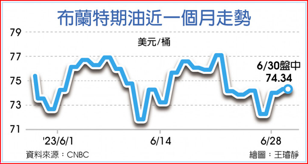 由於美國石油庫存銳減,帶動油價6月30日(周五)走高,預料布蘭特將寫下今年以來首度月線收紅。布蘭特原油期價上揚0.6%至每桶74.75美元,西德州中級原油期價漲0.3%至70.15美元。兩大原油指標6月累計皆漲逾2.5%,這將是2023年以來布蘭特期油首次月線收紅。 |