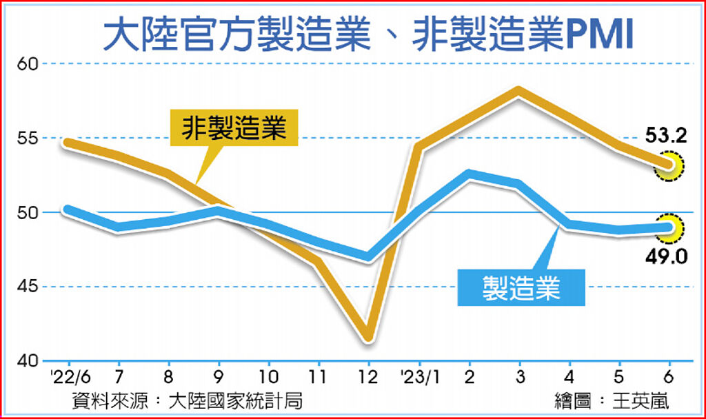大陸統計局數據顯示,6月綜合PMI報52.3,回落0.6。其中,製造業PMI月增0.2至49,連續第三個月處於收縮區間,而非製造業PMI月減1.3至53.2,但仍保持擴張。