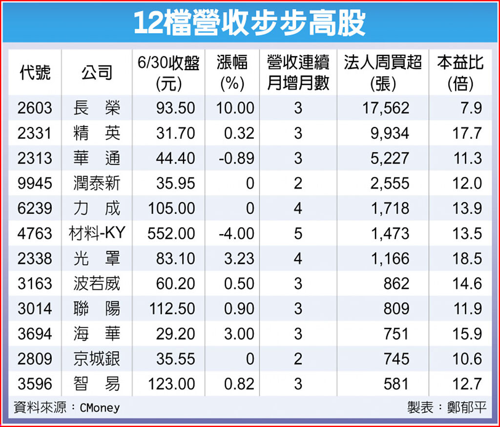 篩選第二季來營收月月增、本益比小於大盤,且法人本周逆勢偏多操作之個股,有長榮、精英、華通、潤泰新、力成、材料-KY、光罩、波若威、聯陽、海華、京城銀、智易等入列;其中,材料-KY單月營收連五月遞增,表現最優;另法人單周買超張數則介於581~1.76萬張不等。