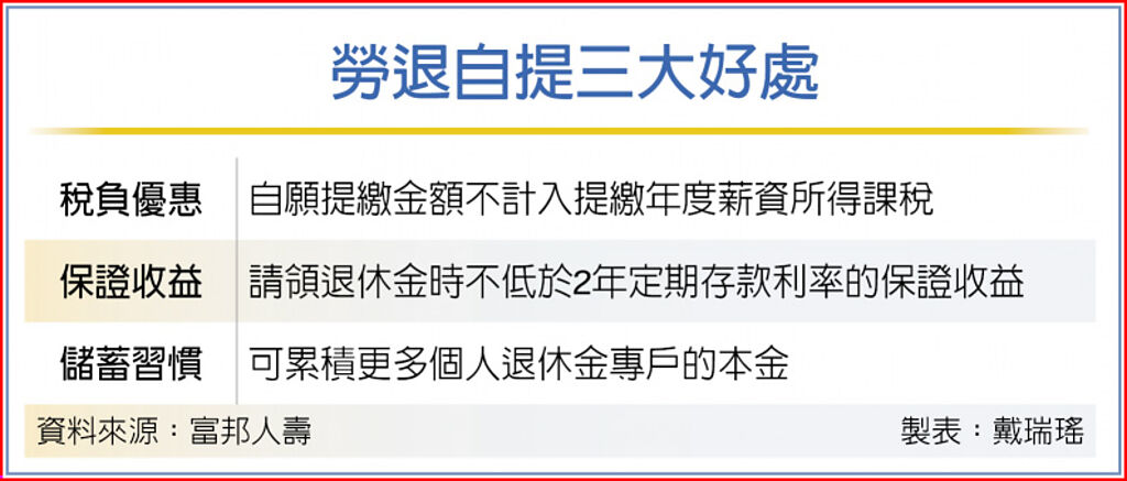 自提勞退金有三大好處,一是稅負優惠,自願提繳金額不計入提繳年度薪資所得課稅;二是保證收益,自願提繳金額可每年參與分配投資運用收益,請領退休金時還享有不低於依2年定期存款利率所計算的保證收益保障;三是儲蓄習慣,累積更多個人退休金專戶的本金,強化退休生活保障。
