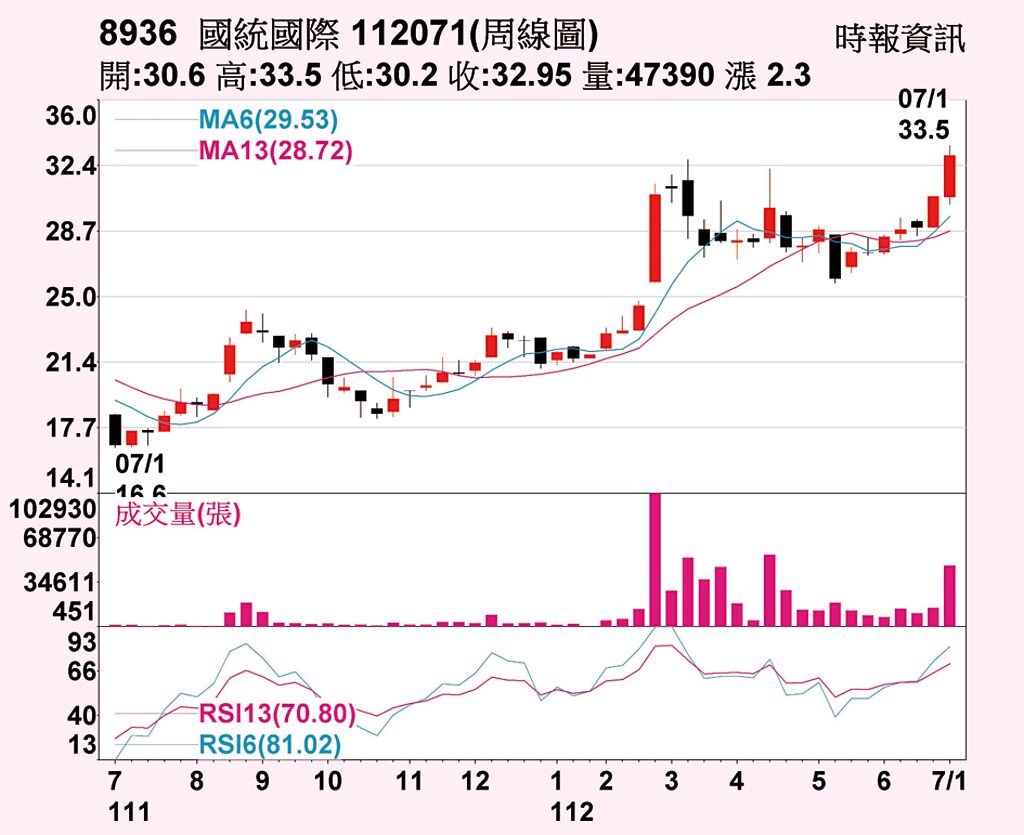 國統的日均線呈現多頭格局,60日均線才剛走揚,股價則沿著5日均線上攻,6月30日的中紅K棒,雖有上影線,但因價過高、量未放大,短期尚未有反轉跡象,如就周線來看,雖然周均線同步多頭結構,但屬於6月30日這周的第二根中紅K棒,未來如欲上攻,將遭遇2021年2月22日到4月26日當周的上波大量套牢籌碼,操作難度將加大。