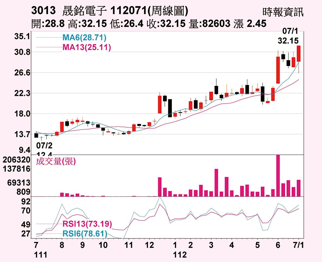 晟銘電(3013)受惠於買盤持續青睞伺服器相關個股之下,因其股價仍處低位階,6月最後一個交易日在特定買盤介入之下,股價爆量漲停,成交衝出3.23萬張大量,終場以漲停板價位32.15元收盤,股價創下波段新高紀錄,漲停排隊買單突破5萬張。