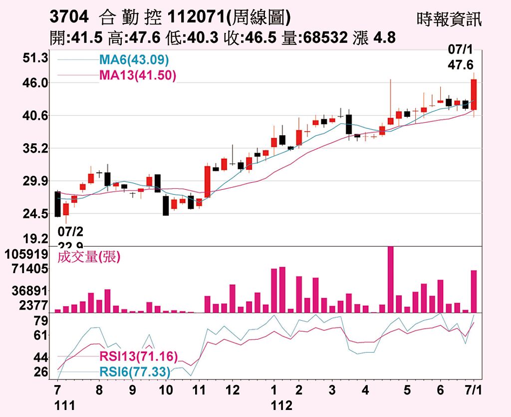 網通股合勤控(3704)連續第三天股價向上衝高,29日盤中一度拉上漲停板價47.6元,惟漲停板被打開,終場上漲7.39%,收在46.5元。