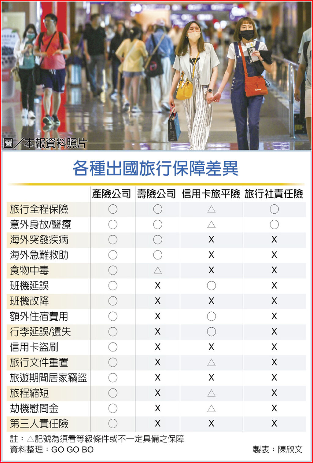 也有不少人是在國內遊玩,出發前投保旅平險或意外險也非常重要。公勝保經GOGO保專案負責人楊振和提醒,壽險公司與產險公司出的意外險,保障範圍也略有不同。產險公司提供的多是保障範圍較廣的套裝組合,保費上相對便宜;但壽險公司的意外險較能保證續約,不會因為前一年度曾經出險,導致下一年度無法承保的窘境,各有優缺,民眾可依實際需求來挑選。