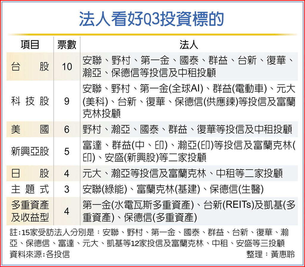 近期日股很火紅,各法人紛紛對日股發表看法,更受投資人關心的是除了已走高的日股之外,法人還看好什麼標的?根據本報對15家法人調查顯示,台股及科技股才是法人在第三季的最愛的標的,分別獲得近三分之二的受訪法人青睞。