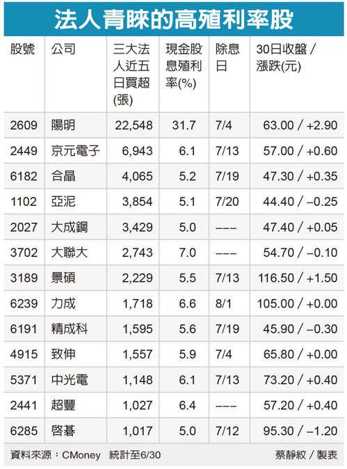 統計上市櫃公司股息殖利率超過5%公司多達403家,當中255家還未除息,但近五個交易日三大法人買超的個股僅15檔,主因近期外資受到聯準會7月升息與否不確定性影響賣超台股。當中,獲得三大法人最多買盤的是陽明,達2.5萬張,超過3,000張還有京元電子、合晶、亞泥與大成鋼,大聯大、景碩也有2,000張以上。