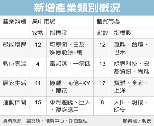 集中與櫃買市場各自新增「綠能環保」、「數位雲端」、「居家生活」、「運動休閒」四大類,櫃買中心並發布「綠能環保類指數」、「數位雲端類指數」、「居家生活類指數」等三檔新產業分類指數,並在盤中每5秒計算及公布一次。